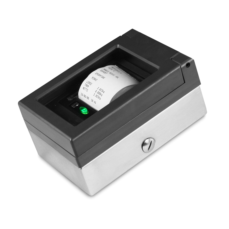 Stampante termica per montaggio sulla colonna del transpallet, con involucro in acciaio INOX e sportello di protezione contro spruzzi e polvere in ABS. Grado di protezione IP65.